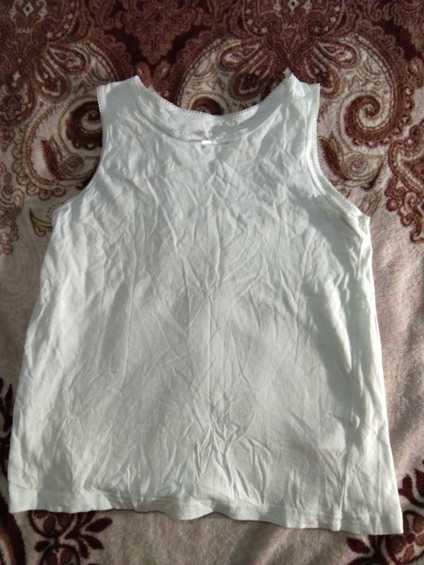 В наличии две майки. одна на возраст 5-6 лет. Другая (с бантиком) где-то на 7-8. хотя все зависит от настроек ребенка. Смотрите замеры на фото. Стан идеален. Беленькие, без пятен и дырочек. Стоимость 20 грн. за одну.