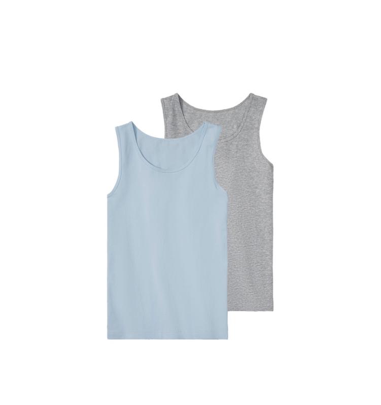 Майки з бавовняного трикотажу з широкими бретелями. Приємний комфорт при носінні завдяки високому вмісту бавовни. Оптимальна посадка завдяки еластану Кількість 2 шт. Склад: 95% бавовна, 5% еластан (LYCRA®) Колір (сірий, блакитний) В наявності розміри: Р. 134-140 на 8-10 років Заміри: Р. 134-140 на 8-10 р Довжина 54 см ПОГ 31 см