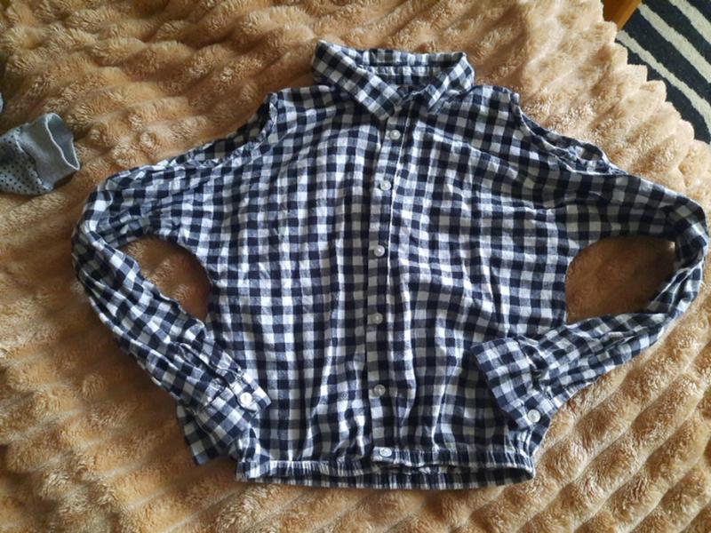 Дуже красива,модна рубашка ,під резинку ,коротенька,має прорізи на плечиках.Довжина 42 см.,рукав 52 см.