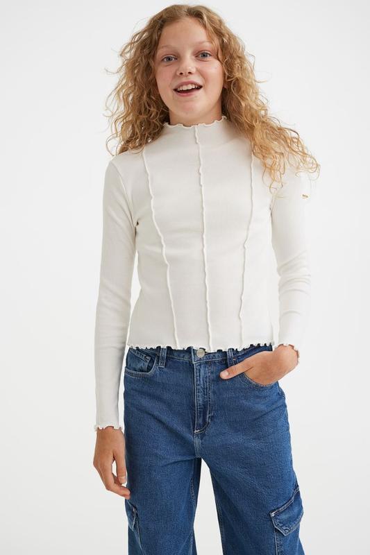 Ребристий топ/лонгслів із довгими рукавами H&M для дівчинки на 12-14 років на р.158/164. Топ/лонгслів з бавовняного джерсі в рубчик. Довгі рукави, стійка комір, видимі шви спереду. Плісовані краю навколо вирізу, манжет та нижнього краю. Cклад. Бавовна 96%, Еластан 4%.