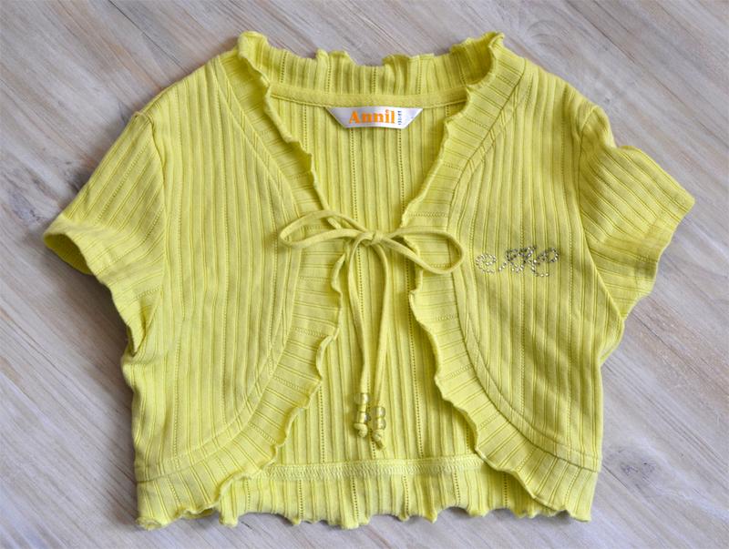 Очень удобная и практичная вещь летом: прохладным утром или вечером можно накинуть поверх сарафана или комбинезона, занимает немного места, почти не мнется (трикотаж в широкий рубчик, приятный и нежный к телу) На фото надето в 7лет, мы иногда надевали это болеро и в 5, и в 6, и в 8 было как раз:) - за счет завязок легко регулировать. Полуобхват груди 33-34, длина от плеча 27-28, плечи 29, рукав 10