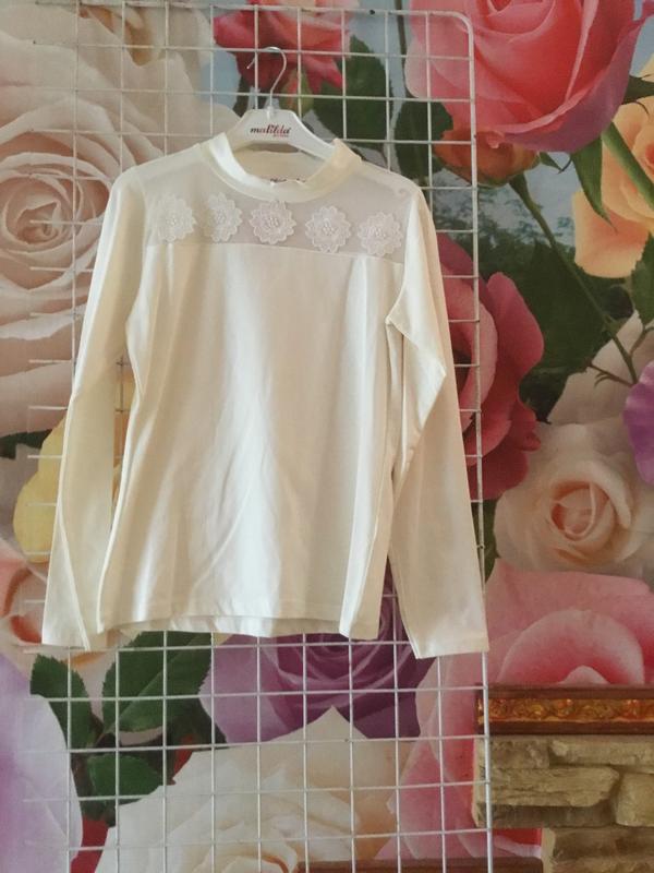 Очень красивая, трикотажная блуза для девочки, отличного качества, производства Турции, идеально подходит для осени и школы и под любой низ, ткань трикотаж хорошо тянется и отлично садится по фигуре ребёнка. Верх блузы идёт сетка по которой идут прошитые цветы, смотрится великолепно, есть размер на рост 128,140,152,164. Цвет- шампань. Шикарная школьная блуза.