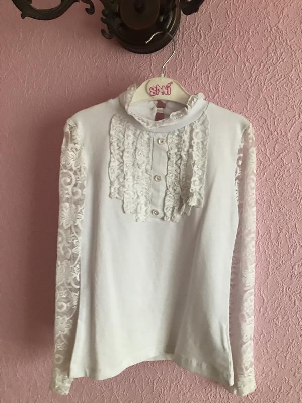 Нарядная блуза для девочки, отличного качества, производства Турции, идеально подходит для осени и школы и под любой низ, хорошо тянется и отлично садится по фигуре, рукава идут гипюровые,размер на рост 128 ( 8 лет). Замеры: длина по спинке 47, ширина под рукавами 33 и тянется, длина рукава 47;