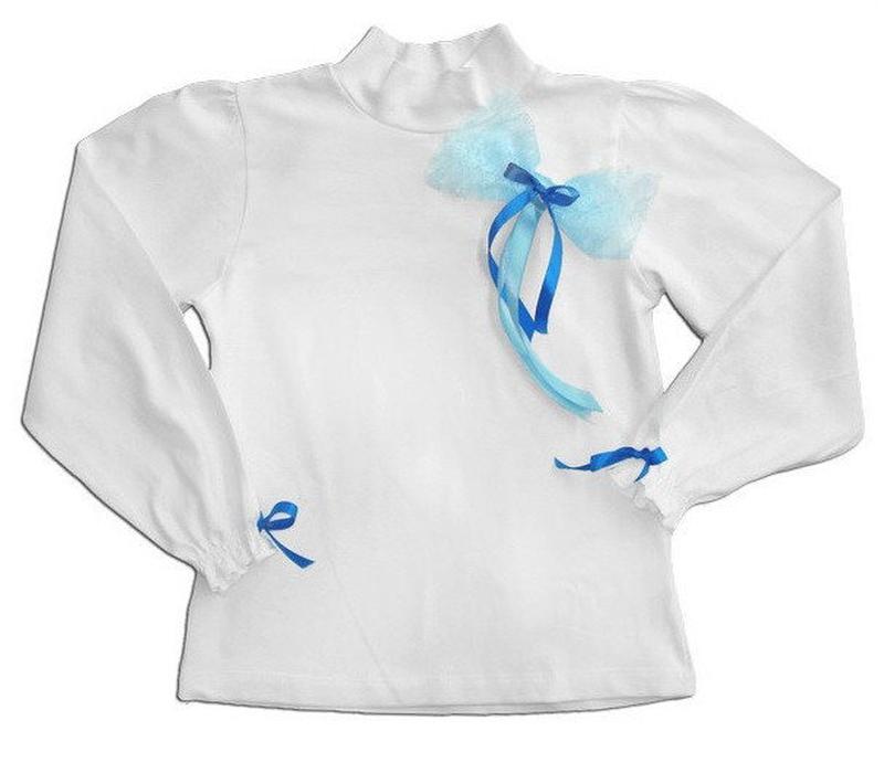 Блуза для девочки, горловина - стойка, украшена гипюровым бантом и атласными ленточками. Низ рукава присобран на узенькой резинке и украшен атласным бантиком, край рукава обработан декоративной опиковкой. Цвет: Белый, бантик голубой; Полотно: Стрейч-кулир; Состав: 95% хлопок, 5% эластан; В наличии: - рост 98, 104, 110, 116 - 100,80 грн. - рост 122, 128, 134, 140 - 120,00 грн..