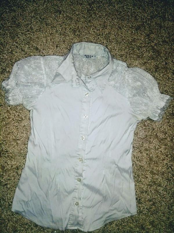 Нарядная блуза для девочки приталенного кроя с отложным воротником и кружевными рукавами. ПОГ - 40 см. ПОТ - 32 см. Длина по спинке - 53 см.