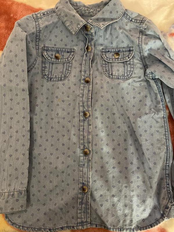 Рубашка на девочку джинсовая. Состояние очень хорошее. Нюанс спереди одно пятнышко небольшое (на последнем фото показала). Материал прочный, носится отлично. Застегивается на пуговицы. Замеры: длина 49 см, ширина в груди 35 см, снизу ширина 37 см, длина рукава 43 см, ширина плеч 26,5 см.