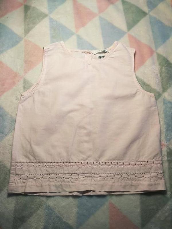 Нежная блузка бледно-розового цвета с мережкой. Сзади - на пуговичках. На возраст 7-8 лет. ПОГ 38 см, длина 39 см.