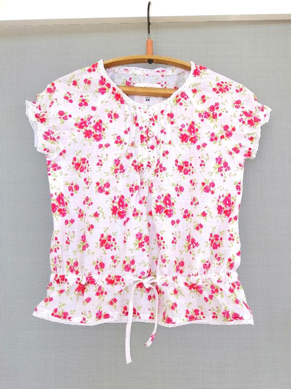 Блуза з тонкого напівпрозорого матеріалу з квітковим принтом. Горловина, рукави та низ прикрашені мереживом. Гумка на рукавах. Застібається на гудзики на грудях. Стягується на шнурок по талії. Заміри: ПОГ - 36 см Довжина - 45 см Плече-рукав - 15 см Ширина низу - 37 см Довжина боки - 27 см