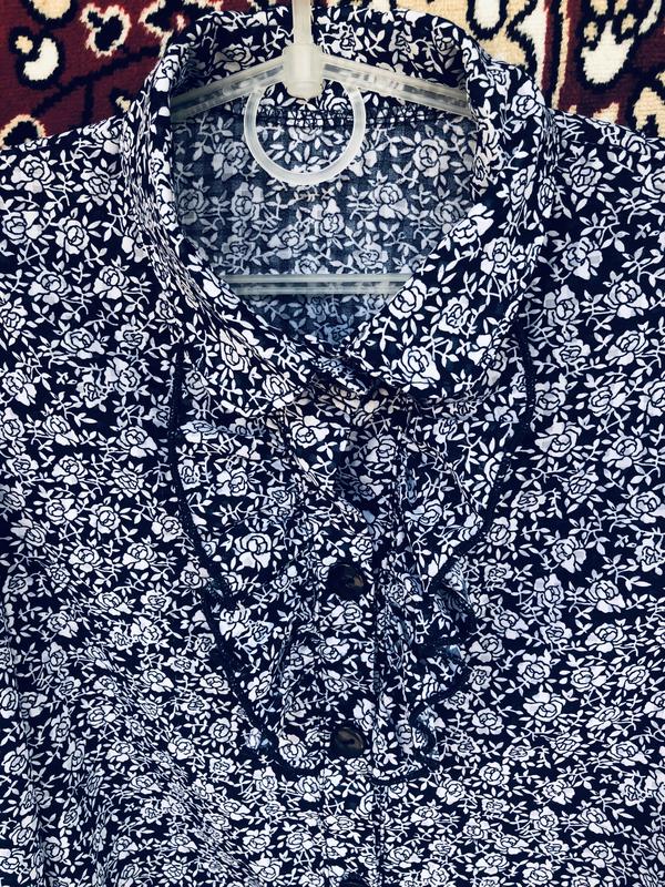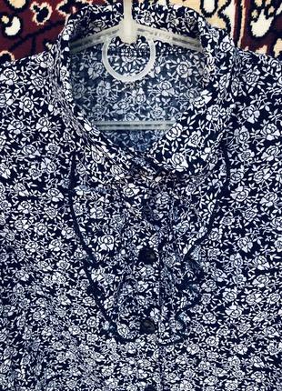 Красивая блузка темно-синего цвета в мелкий цветочек, из жабо. Замеры 140 размера:Плечи 31, ПОГ 34, Длина по спинке 48, Длина рукава 51