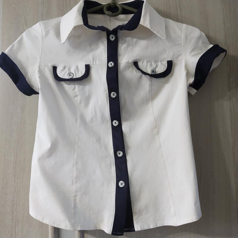 Рубашка белая на девочку 6-7 лет. Белая рубашка, приталенная, стрейч, тянется. Недостаток- нет одной пуговицы на самом верху.