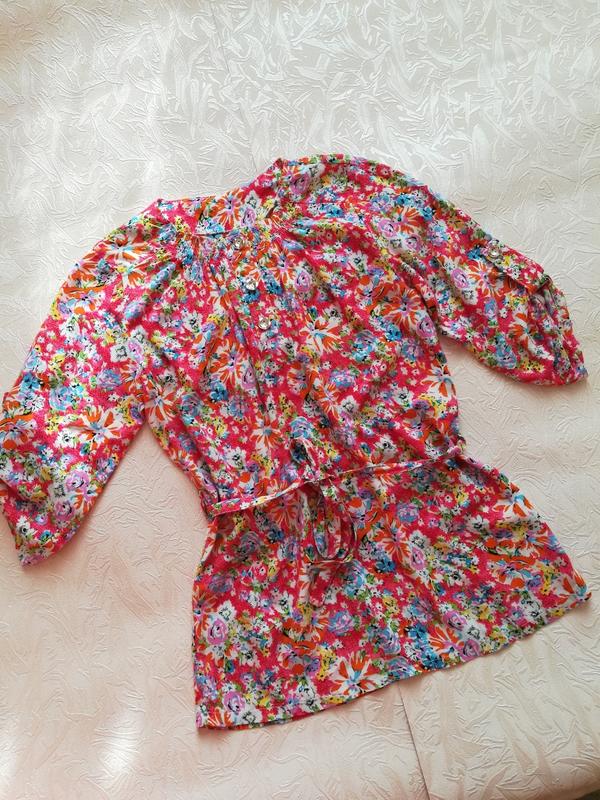 Блузка дуже якісна на дівчинку ріст 140. Стан ідеальний. Під поясок. Можна без. Може бути як туніка або просто блузочка. До тіла дуже приємна. Рукав регулюється.