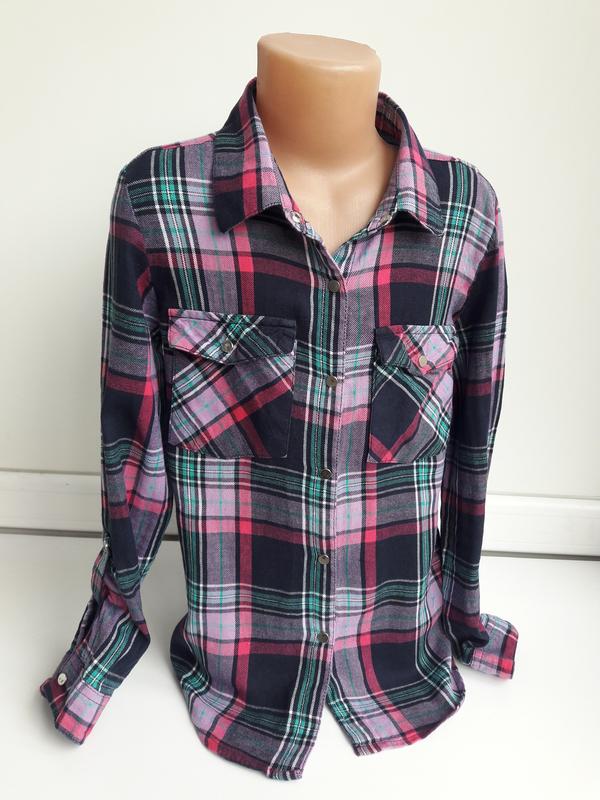 Рубашка для девочки в клетку, впереди на кнопках, 2 нагрудних накладных карманы рукава на монжете.. Состояние новое, длина изделия впереди 50 см, длина ззади 60 см, длина рукава 49 см, ширина плеча 9 см, полуобхват груди 40см.