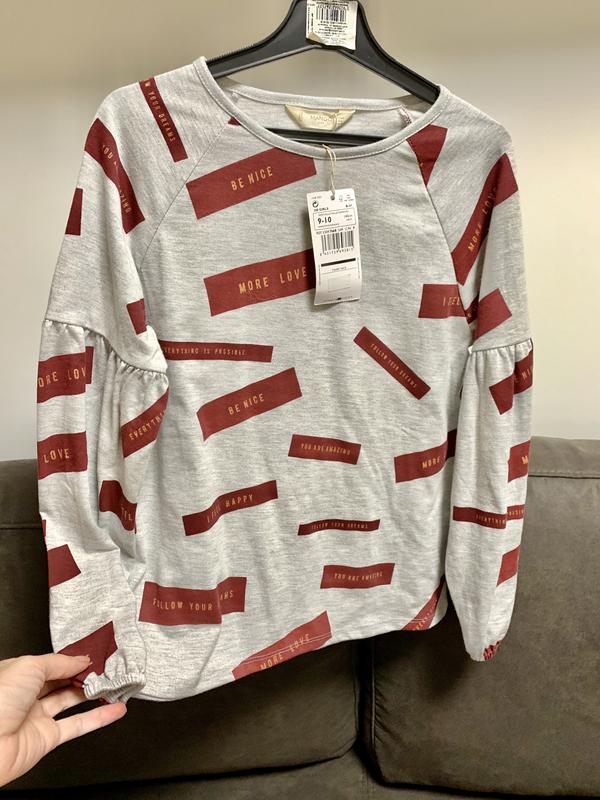 Стильный лонгслив Mango, на девочку 9-10 лет, р 140 Новый с биркой Красивые рукава, аккуратный принт Длина 53 см Пог 40 см Рукав от горловины 58 см заказывала на официальном сайте