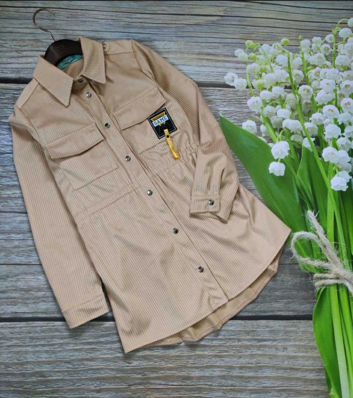 Моднячая рубашка-туника ткань вельвет застегивается на кнопки в поясе утяжка люкс качество 134(2 шт)-длина 62,рукав 49,пог 39 140(2 шт)-длина 67,рукав 53,пог 40 146(2 шт)-длина 69,рукав 55,пог 41 152(2 шт)-длина 72,рукав 58,пог 42