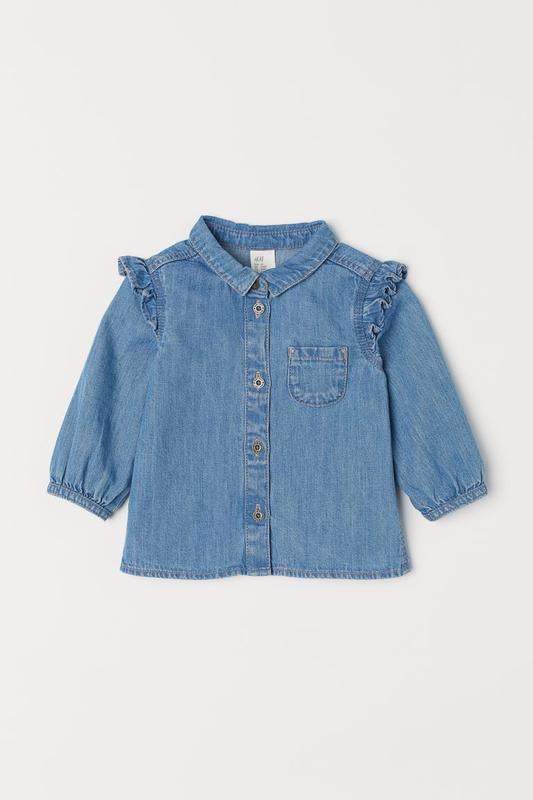 Рубашка из мягкого выстиранного хлопкового денима. Воротничок, пуговицы спереди и открытый нагрудный карман. Кокетка сзади, оборки на плечах длинные рукава с узкими манжетами на пуговицах. 100%бавовна.