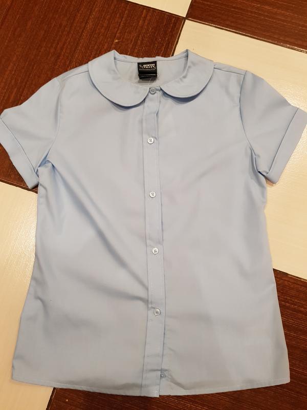 Чудова блузка в школу на дівчинку на зріст десь 152 см. Розмір по етикетці 12. Приємного блакитного кольору. Нова, з етикеткою. Купувала доньці в Метро, але вона так і не носила. Продаю, бо вже замала. Висота по спині 56 см, ПОГ 40 см. Made in Bangladesh. Склад 55 % cotton, 45% polyester.