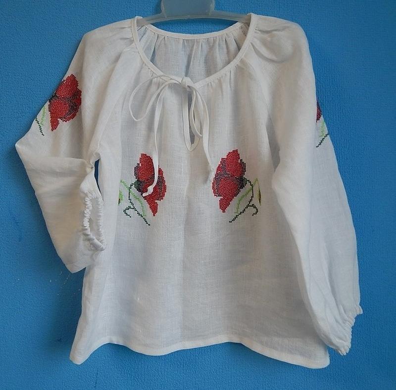 В наявності красива вишиванка для дівчинки з маками (машинна вишивка хрестком). Зроблена в одному екземплярі з натуральних матеріалів: льон. Підійде на зіст 116-122 см, але орієнтуйтесь на заміри: ширина по шрудях 39 см, довжина 43 см, рукав від горловини 44 см.