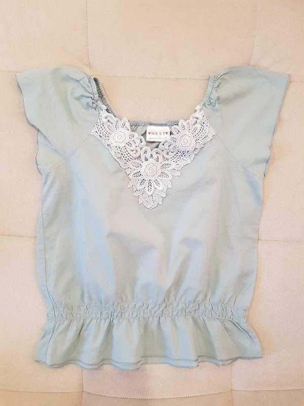 Блузочка на дівчинку на зріст за етикеткою 128 см, але йде десь на 134-140 см або, навіть, 146 см. Ніжна і легенька. Без недоліків. Колір сіро-блакитний. Продаю, бо замала на доньку. Висота по спині 50 см, ПОГ 39 см. Склад 100% cotton.