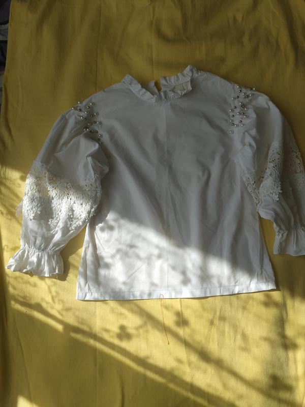 блуза дуже гарна, з ажурною вставкою в рукав і бусінами , дуже вишукано та святково виглядає на дівчинці, має невеликий брак , випала одна бусіна на рукаві є малесенький дирочка, можна пришити нову тоді не видно