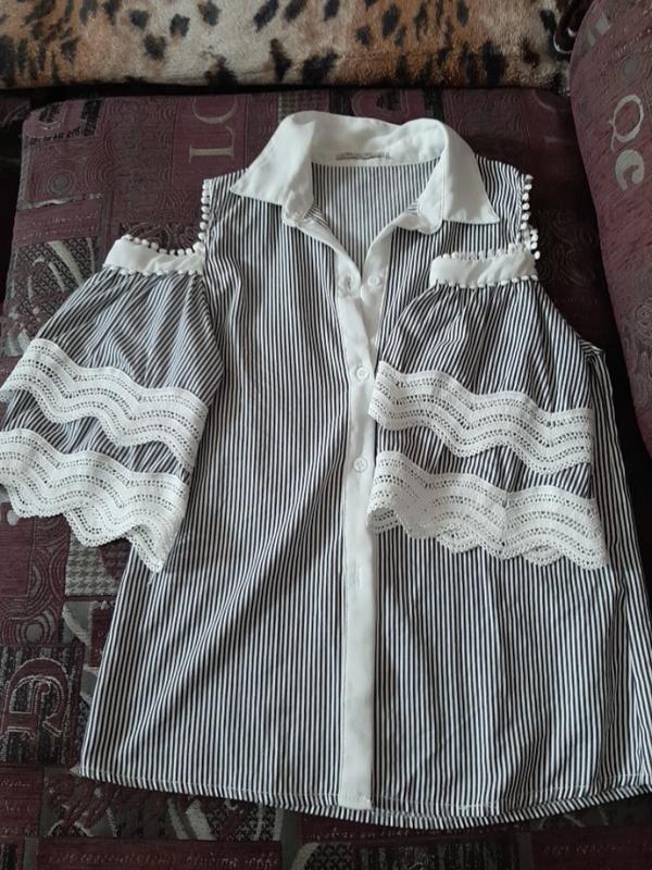 Блуза для девочки, 10-11 лет, белая в темно-синюю полоску, длинна 55 см, ширина 42 см×2, рукав 3/4, плечи немного открыти.