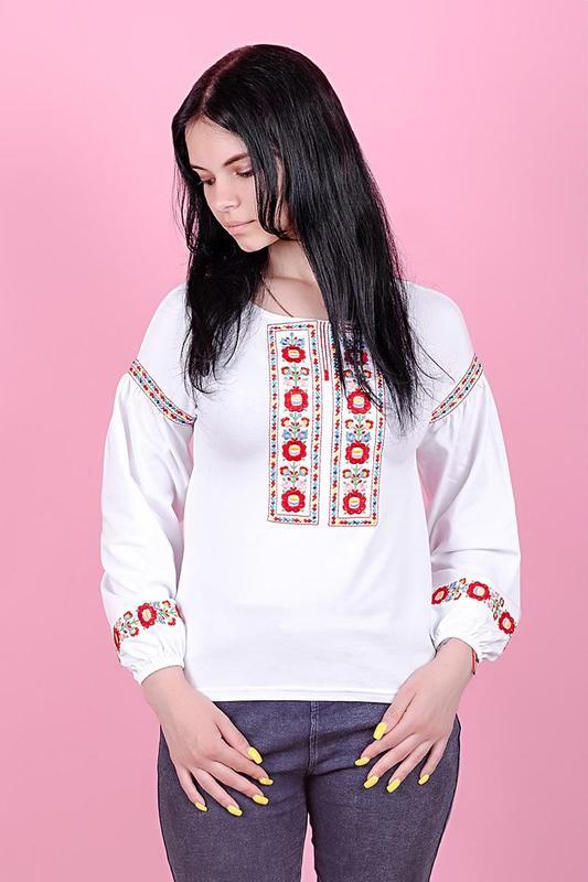 ✔ Вышиванка для девочек-подростков. ➪ Изделие с длинным, цельнокроеным рукавом. ➪ Низ рукава присборен с помощью эластичной тесьмы. ➪ Горловина круглая. ➪ Красивая вышивка украшает рукава и перед изделия. ➪ Полотно: фуликра однотонная, пенье. ➪ Состав: 95% х/б.
