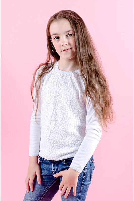 Блуза для девочек сшита из хлопчатобумажного полотна, благодаря чему она мягкая и тонкая. Небольшое количество синтетического волокна в составе материала, делает его износостойким и прочным. Белая блузка имеет длинные рукава и круглую горловину украшенные тесьмой. Изделие спереди декорировано белым гипюром с цветочным узором и маленьким атласным бантиком. Кофточка хорошо сочетается с юбками, брюками, школьной формой. Модель можно надевать на занятия, различные мероприятия, прогулки.