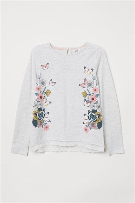 Топ/реглан из джерси с кружевной отделкой для девочки H&M на 1.5-2 года на р.92. Топ/реглан с длинными рукавами из хлопкового трикотажа с набивным рисунком. Вырез на пуговице сзади на шее, кружевная отделка по низу и немного удлиненная задняя часть. Состав. Хлопок 94%, Спандекс 5%, Вискоза 1%.