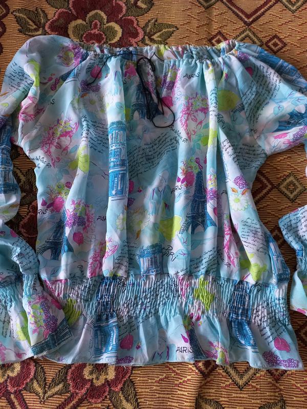 Невероятно красивая шифоновая блузка,яркая, нежная.Стильный принт.Верх регулируется , можно опустить на плечи.Шикарные рукава с резиночкой снизу.Состояние новой.Для девочки 14-16 лет.Очень нарядная.