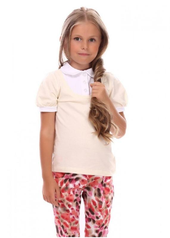 Футболка-блуза для дiвчинки. Склад: 95% бавовна , 5 % еластан. Розмiр: 122 см(7 рокiв) 128 см(8 рокiв) Заміри : Розмір 122 см-5 (6-7 років ) довжина по спинці 44 см ,ширина під рукавами 31 см.
