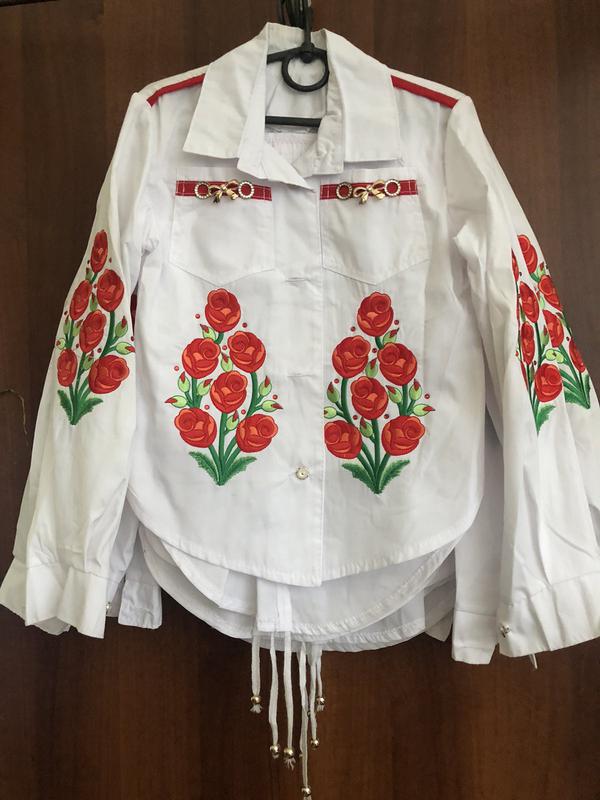 Вишиванка нова. Качественный пошив. 🇺🇦 В ней соединили два стиля современный и украинский. Сзади рубашка удлинена. Имеет очень красивые пуговицы и украшения с камушками. Тканина бавовна. Узоры выполнены машинной вышивкой. В наличии два размера на рост 122, 134. При необходимости сделать замеры)