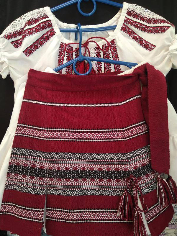 Стан відмінний, неймовірно красивий костюм, в комплект входить вишиванка, пояс під вишиванку, сумочка, спідниця біла, накидка вишита на спідницю. Можна носити окремо, можна разом костюмом виглядає шикарно, купували на заході. До костюма є обруч ручної роботи вишитий гачком і шкарпетки білі короткі з червоними висульками.