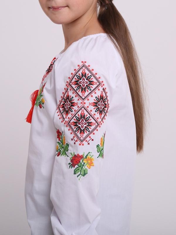 Сорочка для дівчинки з вишивкою на грудях та рукавах. Орнамент поєднує в собі геометричні елементи та квітковий узор. Горловина регулюється за допомогою кутасиків яскравого кольору. Ціна відрізняється в залежності від обраних параметрів розміри 110-170 заміри надам тканина сорочкова