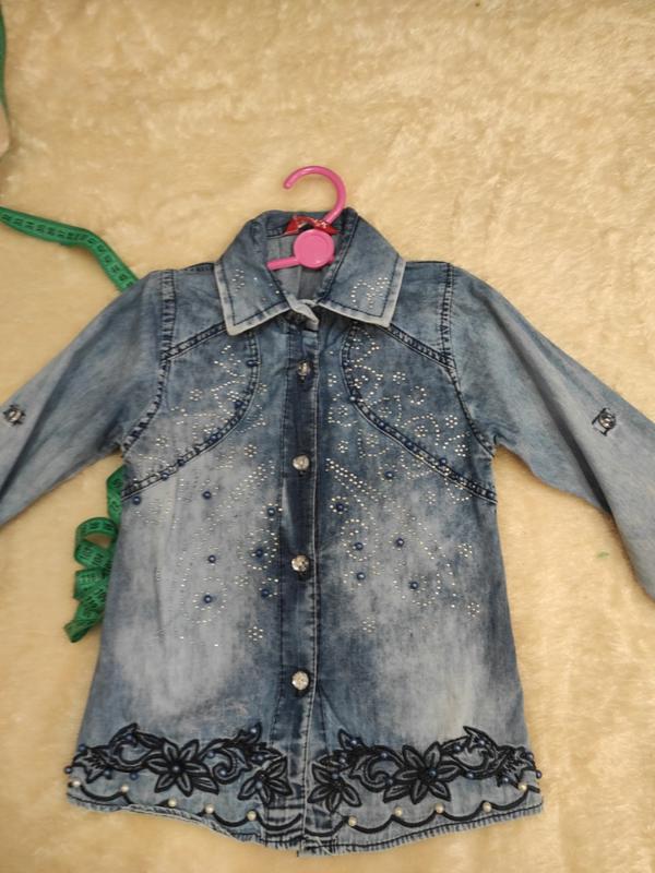 Продам джинсову сорочку для дівчинки на зріст 110-116.Довжина сорочки 43см, довжина рукава 38 см, ширина плечей 26.