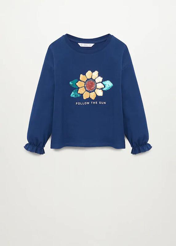 Реглан/лонгслив для девочки/трикотаж MANGO на 6 лет на р.116. Ткань хлопчатобумажная . Украшение пайетками . Круглая шея . Спущенный плечевой шов . Длинные рукава . Манжеты с оборками . СОСТАВ: 100% ХЛОПОК.