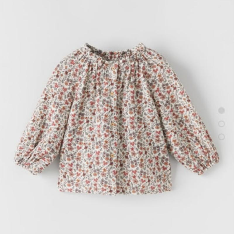 Блузка свободного кроя, выполнена из рельефной ткани с цветочным принтом, высокий воротник эластичный, рукава на резинке, по всей длине застегивается на пуговицы. Состав ткани - хлопок 100%. Размер 18-24 месяцев (рост 92 см).