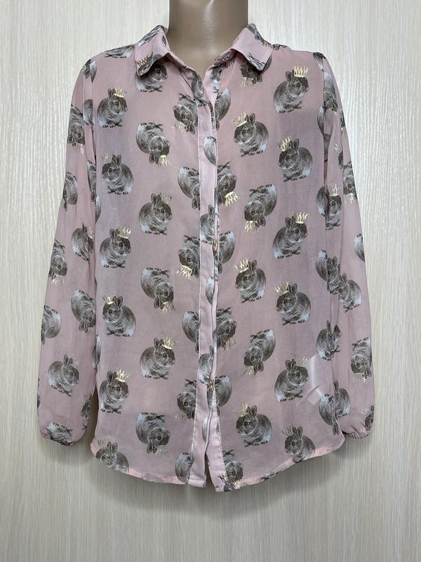 Шифоновая рубашка с кроликами Сзади плиссированная Застёгивается на пуговки Состояние отличное без дефектов 7-8 лет Длина 51/56. ПОГ 39. Рукав 44