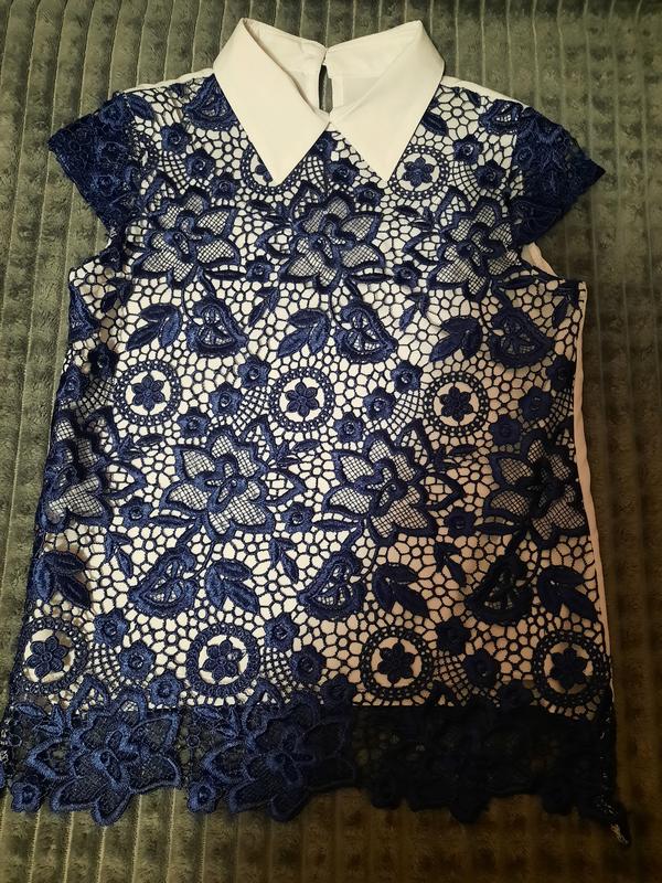 Очень красивая блуза. На рост 134. Длина без кружева 44, с кружевом 51 спереди
