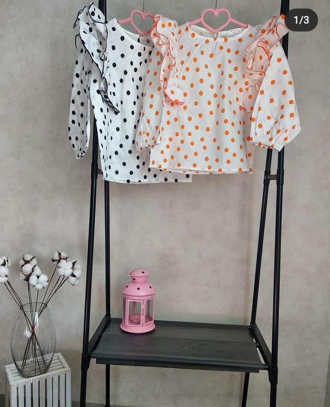 Блузки в горохи з рюшами, ідеально підходять як до спідниці чи сарафану так і до джинсів🖤🧡 Розмір: ✔️120 оранжева ,рукав від горловини:43. довжина:42. ширина:41. ✔️130 чорна, рукав від горловини:44. довжина: 46. ширина:41.