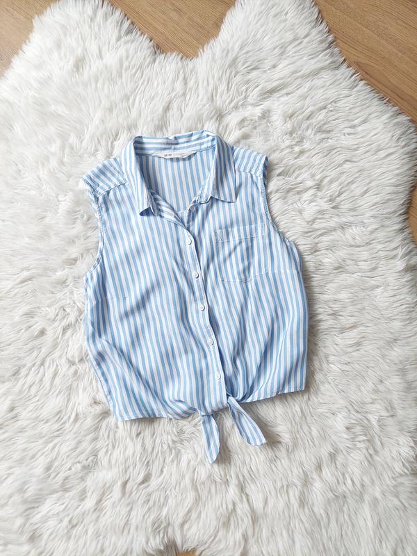 Блузка в полоску H&M на 12-13 років, але реалі можна і на 10. Стан відмінний. Довжина по боку 44 (без довжини зав'язок), плечі 33, пог 40.