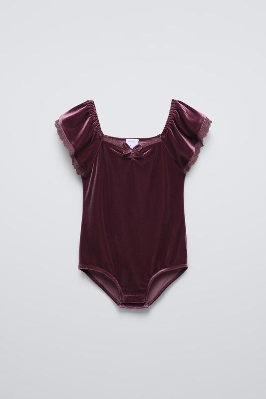 Боди с прямым воротником, короткими рукавами с кружевной окантовкой, заклепками внизу и бантом на груди.