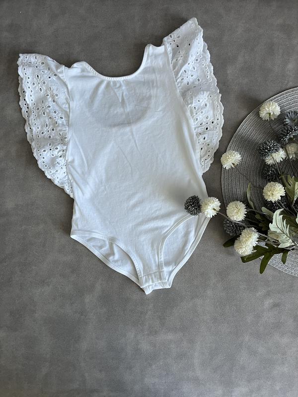 Білосніжний боді на 128 см, стан нового, жодних нюансів чи слідів носіння, неймовірний рукавчик з прошви та відкрита спинка💞 Довжина до трусиків 34 см, повна довжина 49 см Ширина 27-36 см