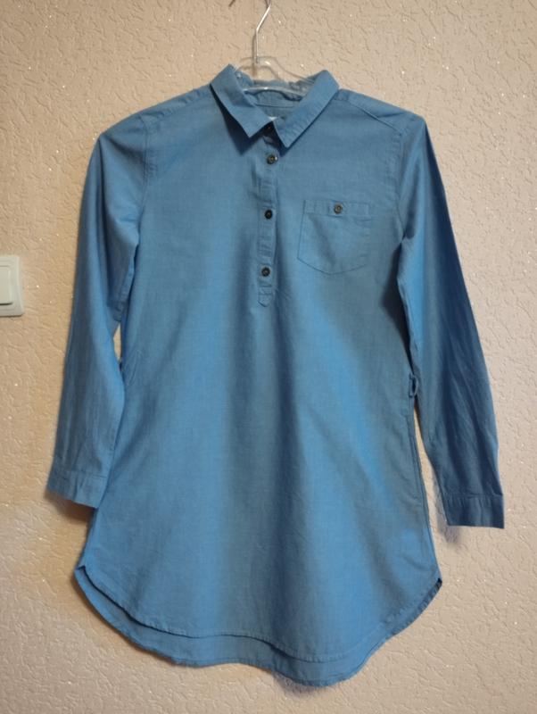 Фирменная удлиненная блуза туника для девочки на рост 152см,11-12роков от H&M. 100%хлопок. Легкая натуральная ткань под джинс. Цвет голубой-дымчатый,джинсовый. Туника приталенная, удлиненная,низ полукругом. На груди накладной карман на пуговицы, застежка на пуговицы. По бокам есть прорезные карманы. Рукава можно сделать короче, специальный застежка и пуговица. Состояние отличное, без дефектов. Замеры: ширина в плечах-35,5см. Длина рукава от плеча-53,5см. Пог-44см. Пот-43см. Поб-49см. Ширина по низу блузы-53см. Длина по спинке, без воротничка-76см. Без торга.