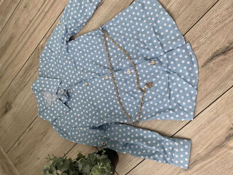 Блуза для девочки. Серо - голубая в белый горошек с поясом. На 9-10 лет. Рукав подкатывается до четвертого. В идеальном состоянии
