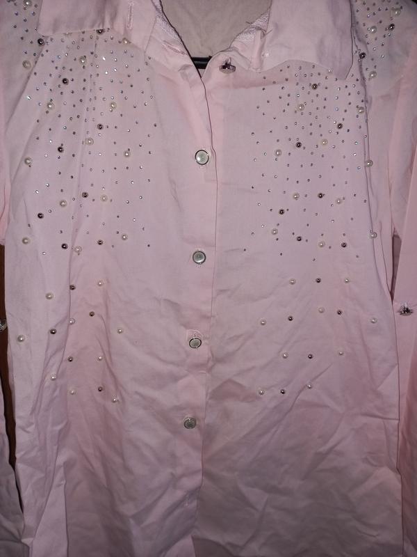 Очень красивая, качественная рубашка с жемчугом.Рукав делается 3/4Тольки не выглажена.