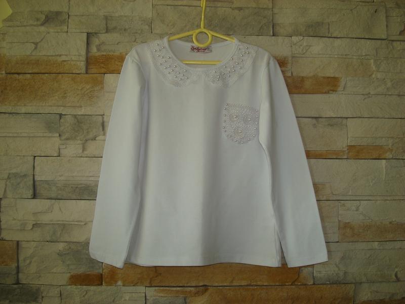 Стильна блузка для дівчинки Viollen (Туреччина). Завжди актуальний білий колір. Комірець і нагрудна кишеня прикрашені мереживом, інкрустованим перлами. М´яка приємна тканина. Чудова якість! Склад: 100% бавовна. Розмір в наявності: 13-14 років (зріст 152-164 см). Заміри: довжина рукава - 47 см, ширина (від пройми до пройми) - 38,5 см, плечі - 34,5 см, довжина по спинці - 50,5 см.