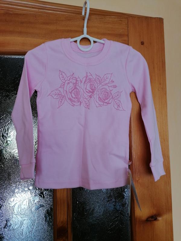 Лонгслив для девочки, новенький, тоненький. Длина от плеча 40см, ширина плеча от рукава до рукава по верхней стойке 24см, полуобхват груди 29см.