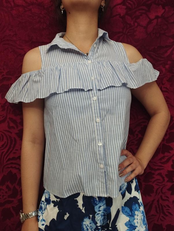 Красивая блузочка для девочки. Написано на рост 12-13 лет. Сбоку крылышки на резке. Бело-голубая в вертикальную полоску. Пошита качественно. Сделана в Румынии. В идеальном состоянии, почти не носилась. Состав натуральный, на фото видно. Без торга.