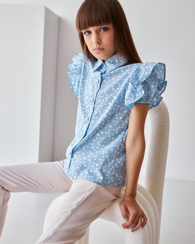 В НАЯВНОСТІ Стильна крута рубашка короткий рукав Тканина котон, хлопок Брошка в комплекті БЛАКИТНА В ГОРОХ: 122р (нет) длина 42, пог 33 128р (1 шт) длина 44, пог 34 134р (1 шт) длина 46, пог 37 140р (1 шт) длина 48, пог 39 146р (1 шт) длина 49, пог 40