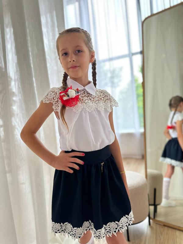 Белая блуза с кружевом. Сзади- на застежке. Отличное качество! Тканина – шифон. Размеры: 116 - длина 44 см 122 - длина 45 см 128 - длина 47 см 134 - длина 48 см Цена: 425 грн