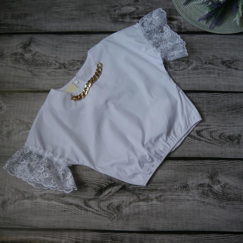 Красивая блуза с кружевом. 🔹140р- длина 42см, полуобхват груди -41см. Цепочка пришита. Ткань натуральная - хлопок + кружево. Внизу зібрана резиночкой. Цвет - белый. м.ст